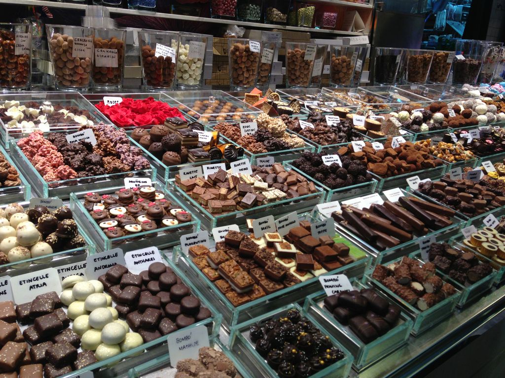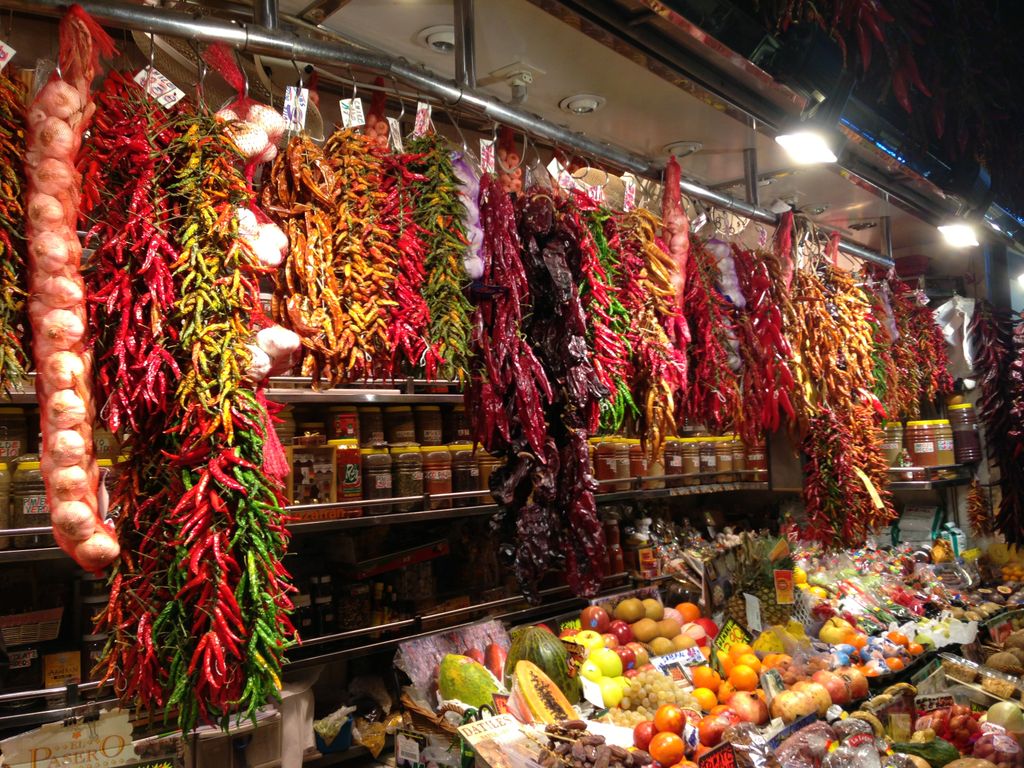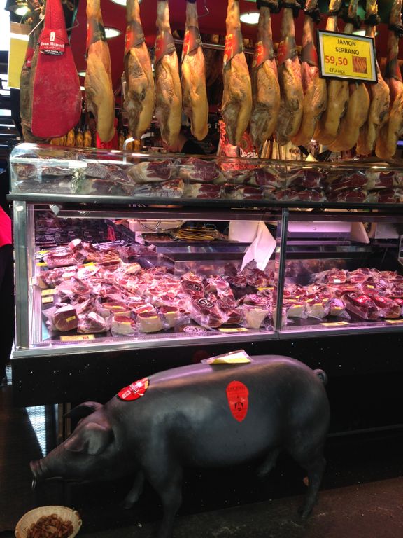 Our hotel is on La Rambla, one of the main drags in the center of Barcelona. About one block away is a world-famous marketplace, called El Mercat de la Boqueria. It is a maze of vendors, selling everything you can imagine, from giant fish heads to hanging pig legs to seas of chocolate, spices, and nuts.