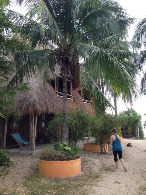 After riding on a bumpy, unpaved road for a few kilometers, we realized that the waterfall might have to wait for another day. Somewhere off of the jungle-lined path, we discovered an oasis of a spot, which turned out to be a cooking school called Tamarind. I was busy trying to figure out what a Tamarind is, envisioning a kind of monkey that lives in the area. Thinking that maybe we might be able to buy a delicious Laotian iced coffee, we walked through palm fronds and past sleeping dogs to a kitchen, where we met Halan. Halan works at the cooking school, and was positively thrilled that we chose his workplace to rest. He offered us a tamarind. As I was preparing myself to ensure that whatever monkey coming my way did not have rabies, he brought out a rough, brown pod about five inches in length.